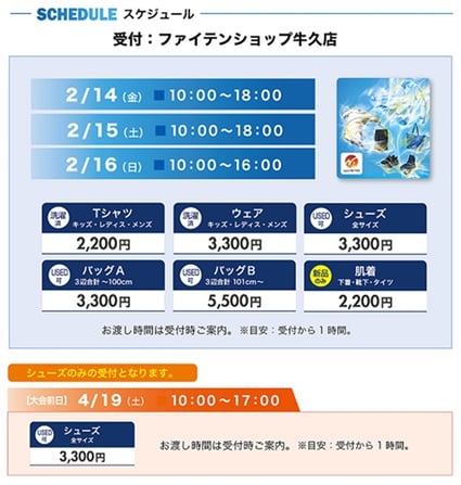② 4月19日(土)10:00~17:00 ※シューズのみ受付。