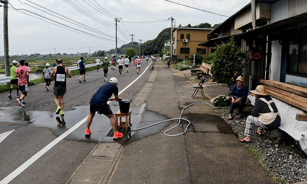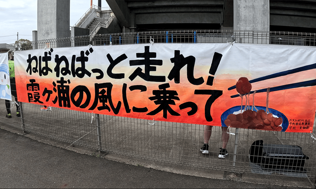 コース前半にも「おいもステーション」などの目玉がありますが、後半も私設を含めて充実のエイドが目白押し! 塩分補給に良い梅干しや、地元名産のレンコンの天ぷら、糖質補給にはもってこいのおにぎり、パン、そして大会名物の「おしるこステーション」もあります。全部口にしていたら、逆に走れなくなるかも(笑)。 何より、アップダウンがほぼないのが“撃沈ランナー”にはありがたし(私も何度救われたか…)。コールドスプレーや水シャワーを浴びて、湖の向こうの牛久大仏を探したり、レンコン畑の収穫の様子に驚いたり、世相も反映した茨城弁の応援川柳に笑って気分転換したり。いろんな楽しみ方をしてみてください。