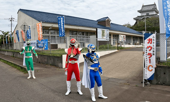 20km付近にも起伏があり、お城のような歴史博物館の前で「ご当地戦隊ガウラーC」の出迎えを受けると中間点。そしてその先が、右手に雄大な霞ヶ浦が姿を見せるハイライト、500mほど続く長い下り坂です。いよいよ湖畔を西へ走る後半戦へ!